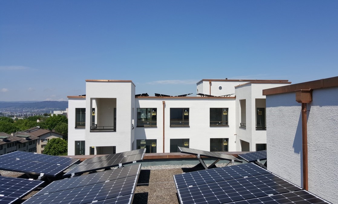 Zu einer zukunftsgerichteten Wohnform gehört ein verlässliches, tragfähiges Energiekonzept. Dementsprechend wurden auf sechs der sieben Gebäude der Überbauung PV-Anlagen mit einer speziellen Unterkonstruktion nach Vorgaben von Grün Stadt Zürich installiert. Durch die erhöhte Montage der Panels kommt es nicht zu einer Verschattung, welche die Dachbegrünung in ihrem Wuchs behindern würde. Zudem wird die Anlage besser gekühlt. Die Gesamtleistung der PV-Anlage beträgt 190 kWp.